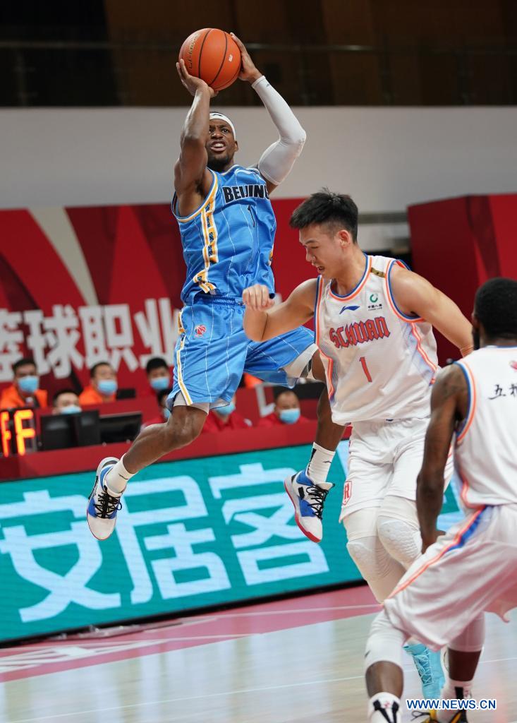 Jonathan Gibson (top) of Beijing Ducks shoots the ball during the 49th round match between Beijing Ducks and Sichuan Blue Whales at the 2020-2021 season of the Chinese Basketball Association (CBA) league in Zhuji, east China's Zhejiang Province, March 27, 2021. (Xinhua/Meng Yongmin)
