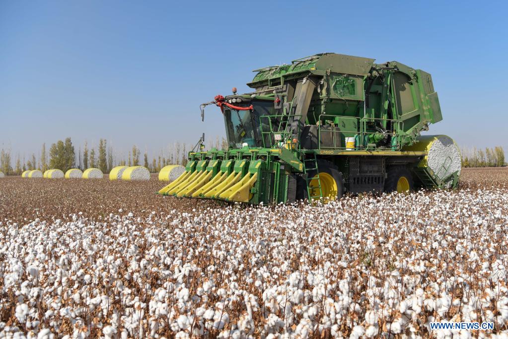 Photo taken on Oct. 17, 2020 shows a machine harvesting cotton in a field in Wenjiazhuang Village, Manasi County of northwest China's Xinjiang Uygur Autonomous Region. (Xinhua/Ding Lei)
