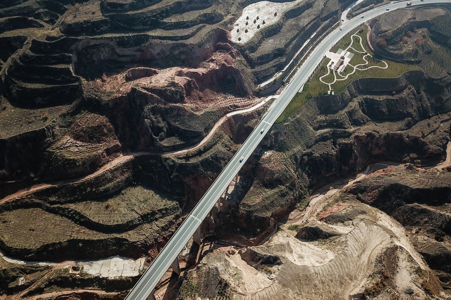 Aerial photo taken on Nov. 9, 2020 shows the Zhehong highway in Bulenggou Village, Dongxiang Autonomous County of northwest China's Gansu Province. (Xinhua/Ma Xiping)