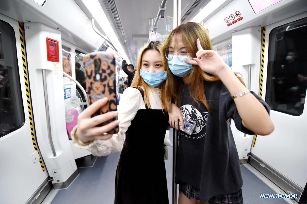 Passengers take a selfie in a train on Subway Line 1 in Luoyang, central China's Henan Province, March 28, 2021. Luoyang Subway Line 1, with a length of about 25km and 19 stations, was put into operation on Sunday. (Photo by Zhang Yixi/Xinhua)