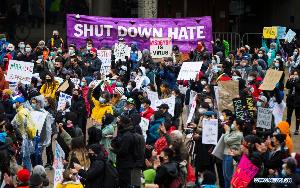 People rally for the "Stop Asian Hate" movement in Toronto, Canada, on March 28, 2021. Hundreds of people in Toronto took part in different protests against the racism toward Asians in the United States and Canada on Sunday. (Photo by Zou Zheng/Xinhua)
