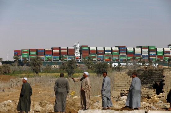 Photo taken on March 29, 2021 shows the container ship Ever Given moving on the Suez Canal, Egypt. The traffic in Suez Canal resumed after massive container ship Ever Given has been successfully refloated as being stranded in the canal for almost a week, Egypt's Suez Canal Authority (SCA) said on Monday. (Xinhua/Ahmed Gomaa)