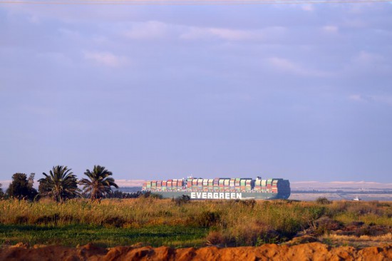 Photo taken on March 29, 2021 shows the container ship Ever Given moving on the Suez Canal, Egypt. The traffic in Suez Canal resumed after massive container ship Ever Given has been successfully refloated as being stranded in the canal for almost a week, Egypt's Suez Canal Authority (SCA) said on Monday. (Xinhua/Sui Xiankai)