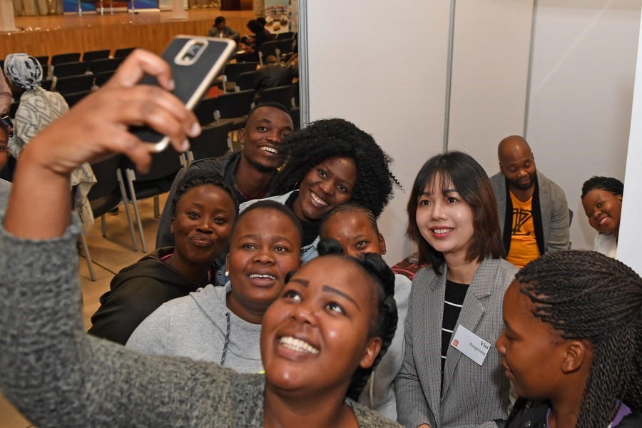 Job hunters take selfies with a Chinese employer at a job fair in Johannesburg, South Africa, April 8, 2019. (Xinhua/Chen Cheng)