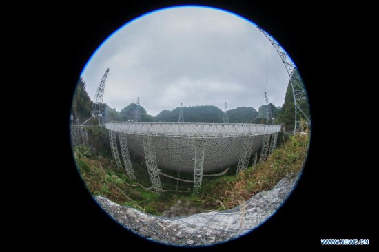 Panoramic photo taken on March 28, 2021 shows China's Five-hundred-meter Aperture Spherical radio Telescope (FAST) under maintenance in southwest China's Guizhou Province. FAST has identified over 300 pulsars so far. Located in a naturally deep and round karst depression in southwest China's Guizhou Province, it officially began operating on Jan. 11, 2020. (Xinhua/Ou Dongqu)