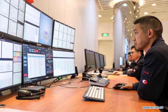 Staff members work at the control room of China's Five-hundred-meter Aperture Spherical radio Telescope (FAST) in southwest China's Guizhou Province, March 27, 2021. FAST has identified over 300 pulsars so far. Located in a naturally deep and round karst depression in southwest China's Guizhou Province, it officially began operating on Jan. 11, 2020. (Xinhua/Ou Dongqu)