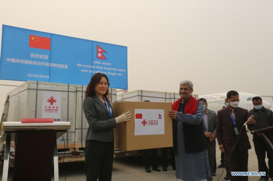 Chinese Ambassador to Nepal Hou Yanqi (1st L) and Nepali Health Minister Hridayas Tripathi attend a welcome ceremony for China-donated COVID-19 vaccines at Tribhuvan International Airport in Kathmandu, Nepal, on March 29, 2021. A chartered flight of the Nepal Airlines, the national flag carrier, brought back the vaccines donated by China on Monday, giving a major boost for Nepal to continue its vaccination campaign against the pandemic. (Xinhua/Zhou Shengping)