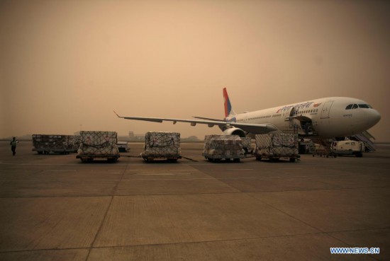 China-donated COVID-19 vaccines are unloaded at Tribhuvan International Airport in Kathmandu, Nepal on March 29, 2021. A chartered flight of the Nepal Airlines, the national flag carrier, brought back the vaccines donated by China on Monday, giving a major boost for Nepal to continue its vaccination campaign against the pandemic. (Photo by Sulav Shrestha/Xinhua)