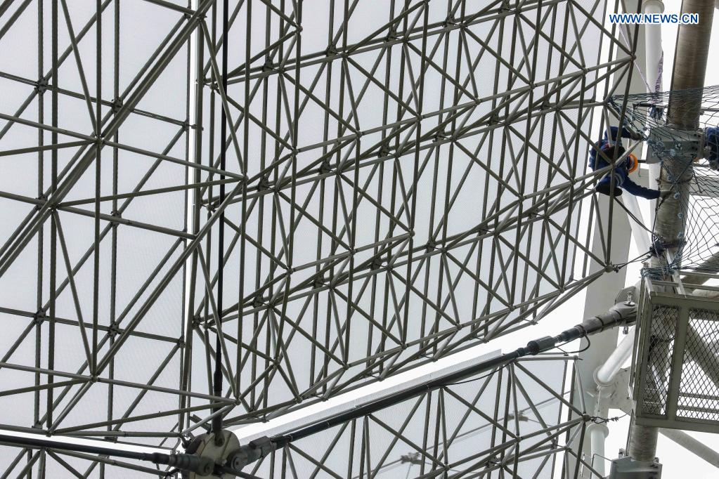 A staff member checks the reflector panels during a regular maintenance operation to the Five-hundred-meter Aperture Spherical Radio Telescope (FAST) in Pingtang County, southwest China's Guizhou Province, March 28, 2021. Starting formal operations in Jan. 11, 2020, the FAST is believed to be the largest and most sensitive radio telescope in the world, which has a huge potential for verifying and exploring mysteries of the universe. (Xinhua/Ou Dongqu)