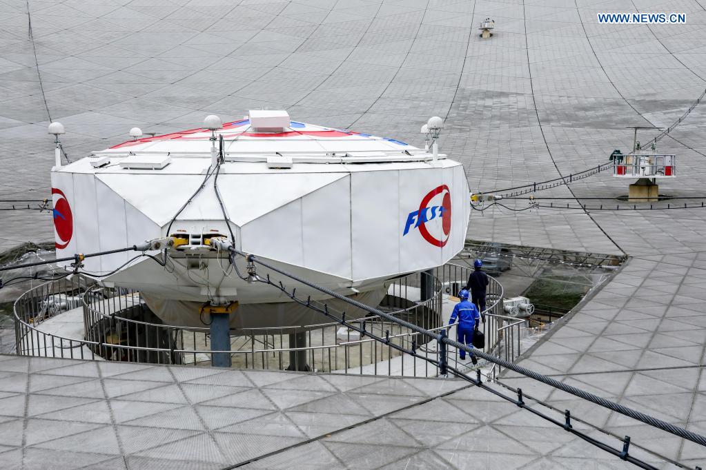 Staff members enter the feed cabin during a regular maintenance operation to the Five-hundred-meter Aperture Spherical Radio Telescope (FAST) in Pingtang County, southwest China's Guizhou Province, March 28, 2021. Starting formal operations in Jan. 11, 2020, the FAST is believed to be the largest and most sensitive radio telescope in the world, which has a huge potential for verifying and exploring mysteries of the universe. (Xinhua/Ou Dongqu)