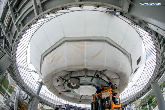Photo taken with a fisheye lens on March 28, 2021 shows staff members conducting maintenance work on the feed cabin of the Five-hundred-meter Aperture Spherical Radio Telescope (FAST) in Pingtang County, southwest China's Guizhou Province. Starting formal operations in Jan. 11, 2020, the FAST is believed to be the largest and most sensitive radio telescope in the world, which has a huge potential for verifying and exploring mysteries of the universe. (Xinhua/Ou Dongqu)
