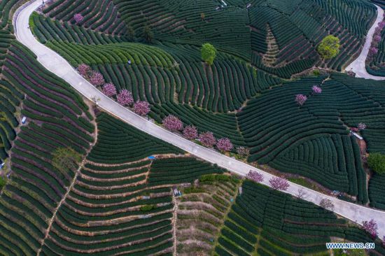 Aerial photo taken on March 29, 2021 shows a view of cherry blossoms in a tea garden at Bashan Village, Fuyang District, Hangzhou City in east China's Zhejiang Province. (Xinhua/Xu Yu)