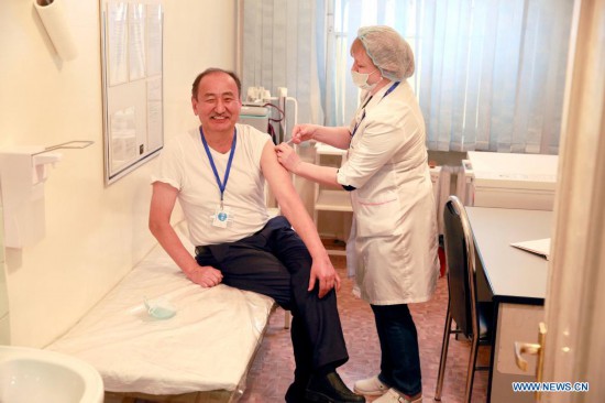 Kyrgyzstan's Minister of Health and Social Development Alymkadyr Beishenaliev receives a shot of Chinese COVID-19 vaccine in Bishkek, capital of Kyrgyzstan, March 29, 2021. The first stage of a COVID-19 vaccination campaign using Chinese vaccines kicked off in Kyrgyzstan on Monday. Minister of Health and Social Development of the country Alymkadyr Beishenaliev and his deputies were the first who received the vaccination. (Photo by Roman/Xinhua)