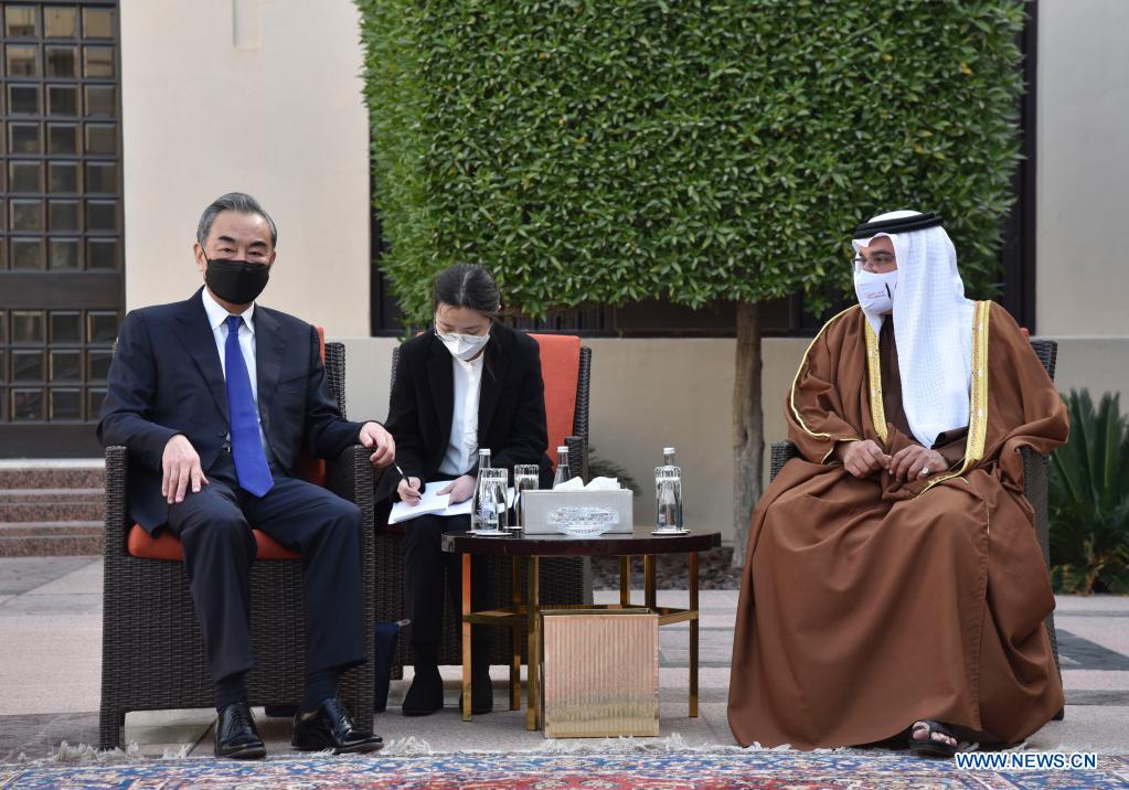 Bahraini Crown Prince and Prime Minister Salman bin Hamad Al Khalifa (R) meets with visiting Chinese State Councilor and Foreign Minister Wang Yi (L) in Manama, Bahrain, March 29, 2021. (Xinhua/Tu Yifan)