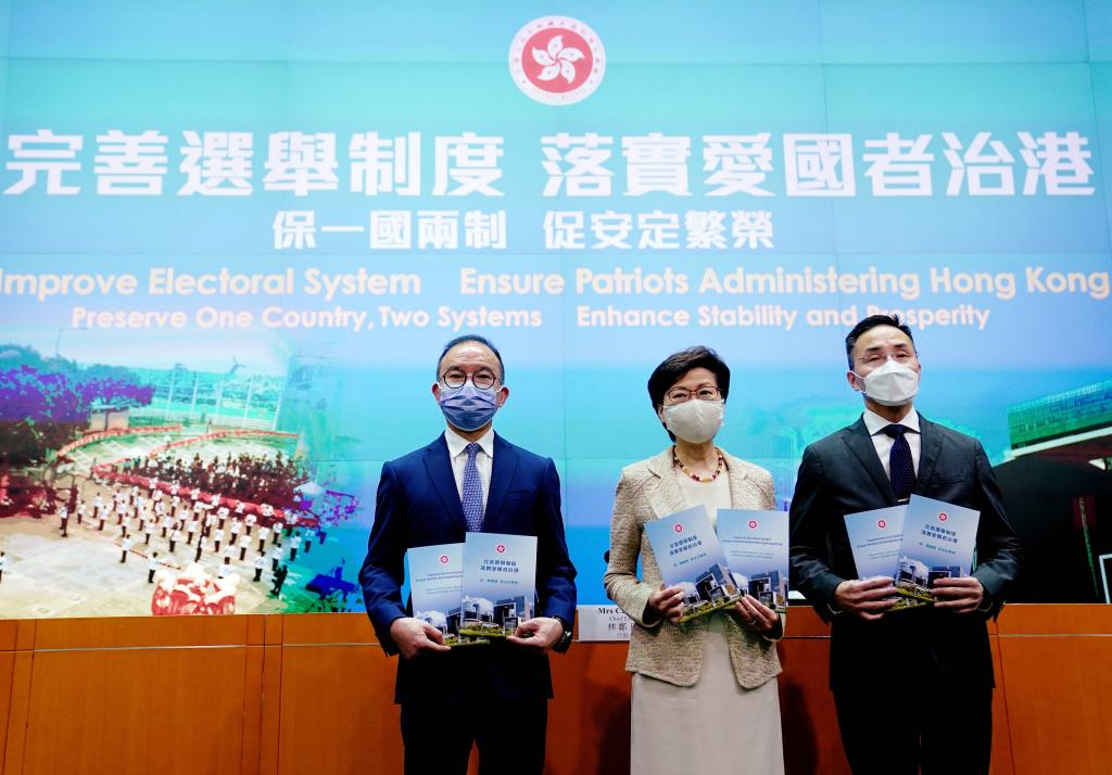Carrie Lam (C), Chief Executive of the Hong Kong Special Administrative Region (HKSAR), presents pamphlets on improving electoral system and ensuring patriots administering Hong Kong in south China's Hong Kong, March 30, 2021. Carrie Lam Tuesday said that she and the governing team of the HKSAR government strongly support China's top legislature's adoption of amended Annexes I and II to the HKSAR Basic Law. (Xinhua/Wang Shen)