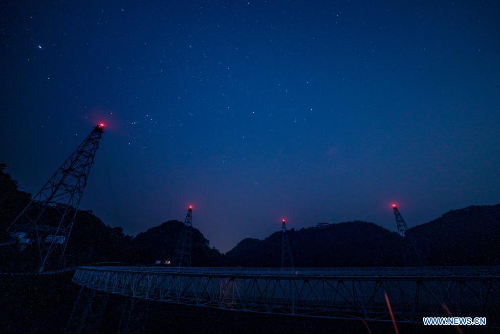 Photo taken on March 30, 2021 shows China's Five-hundred-meter Aperture Spherical Radio Telescope (FAST) under maintenance at night in southwest China's Guizhou Province. China's Five-hundred-meter Aperture Spherical Radio Telescope (FAST) officially opened to the world starting Wednesday. (Xinhua/Ou Dongqu)