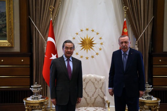 Turkish President Recep Tayyip Erdogan (R) meets with visiting Chinese State Councilor and Foreign Minister Wang Yi in Ankara, Turkey, on March 25, 2021. (Photo by Mustafa Kaya/Xinhua)
