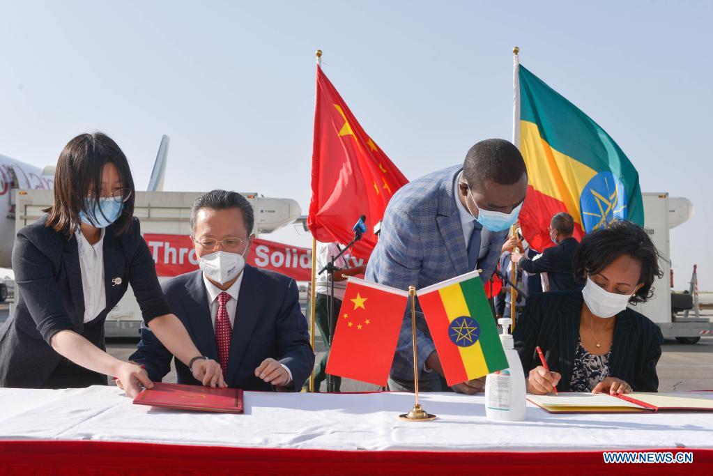 Chinese Ambassador to Ethiopia Zhao Zhiyuan (2nd L) and Ethiopia Minister of Health Lia Tadesse (1st R) sign a contract for handover of COVID-19 vaccines from China at the Addis Ababa Bole International Airport in Addis Ababa, Ethiopia, on March 30, 2021. A batch of China's Sinopharm COVID-19 vaccines, donated by the Chinese government to Ethiopia, arrived here on Tuesday. (Photo by Michael Tewelde/Xinhua)