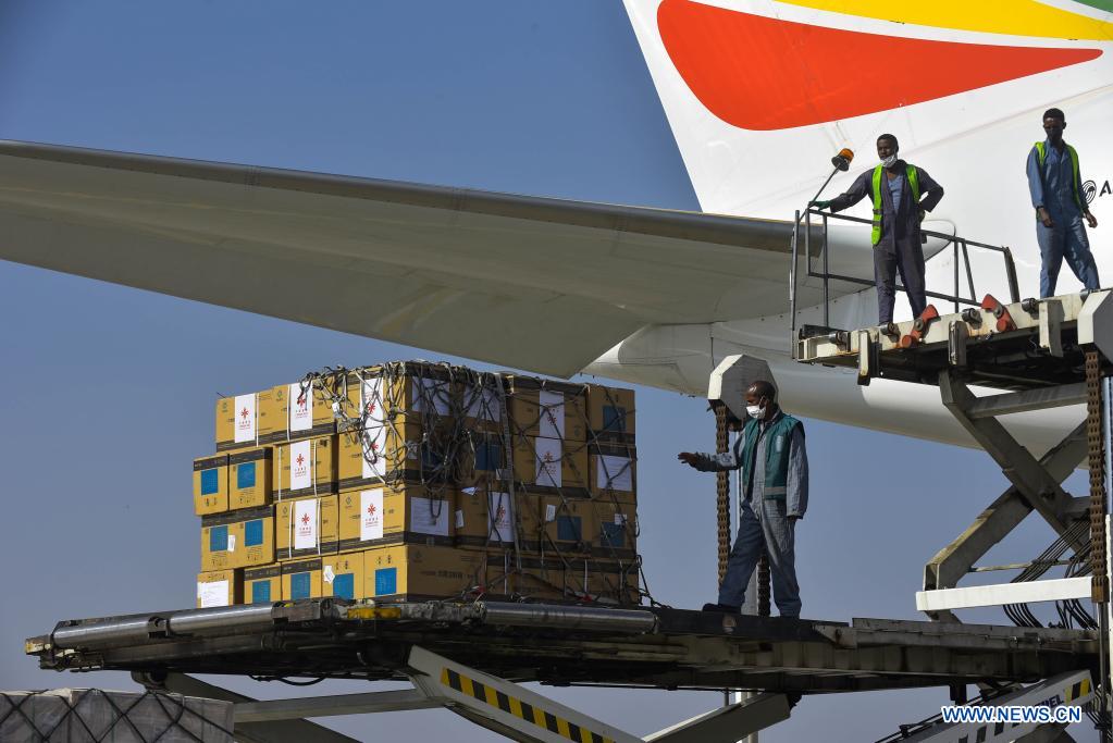 Workers unload China's Sinopharm COVID-19 vaccines, donated by the Chinese government to Ethiopia, at the Addis Ababa Bole International Airport in Addis Ababa, Ethiopia, on March 30, 2021. (Photo by Michael Tewelde/Xinhua)