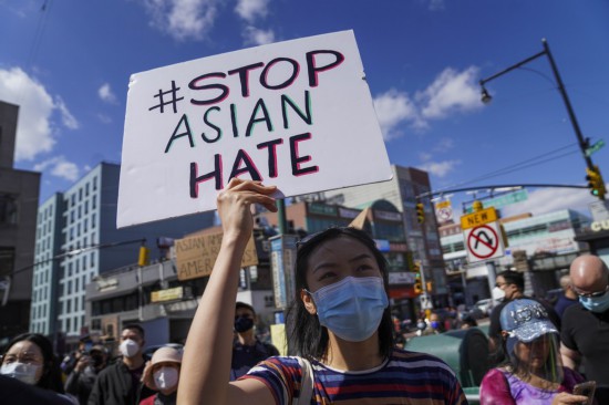 People attend a rally against racism and violence on Asian Americans in Flushing of New York, the United States, March 27, 2021. (Xinhua/Wang Ying)