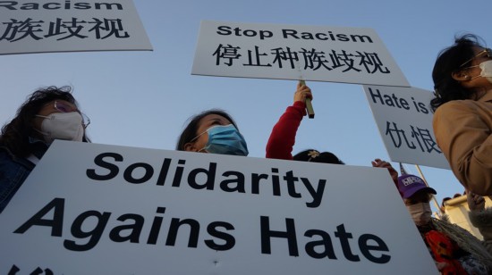 People denouncing hatred against the Asian American communities rally before San Gabriel Mission Playhouse in City of San Gabriel, Los Angeles County, California, the United States, March 20, 2021. (Photo by Zeng Hui/Xinhua)