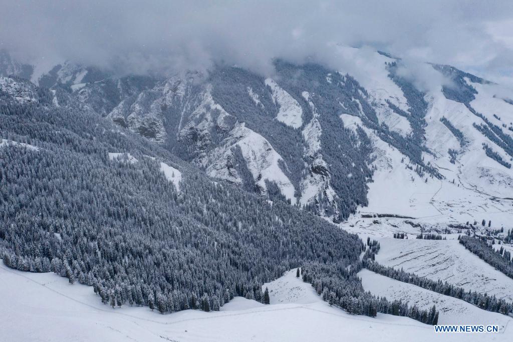 Aerial photo shows the snow scenery of Tianshan Mountains in Shawan City, northwest China's Xinjiang Uygur Autonomous Region, March 30, 2021. (Xinhua/Hu Huhu)