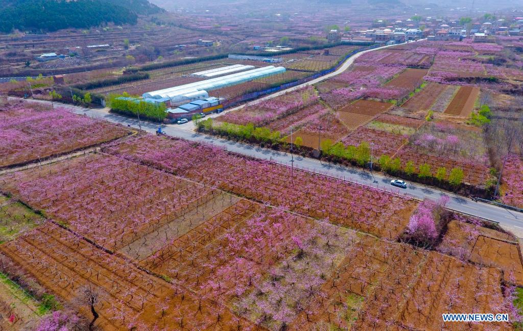 Aerial photo taken on March 30, 2021 shows peach blossoms in Jinan, east China's Shandong Province. (Xinhua/Zhu Zheng)