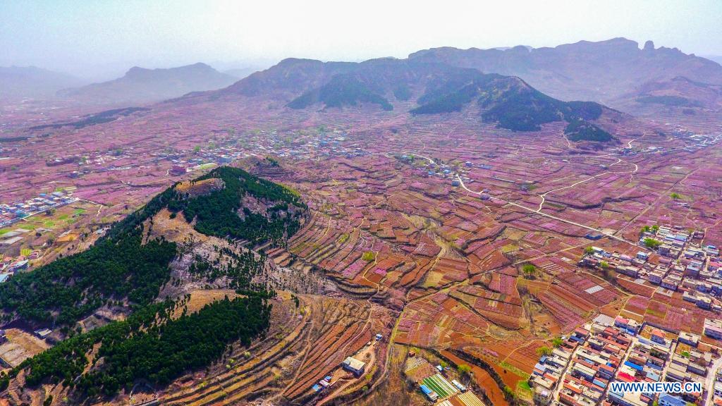 Aerial photo taken on March 30, 2021 shows peach blossoms in Jinan, east China's Shandong Province. (Xinhua/Zhu Zheng)