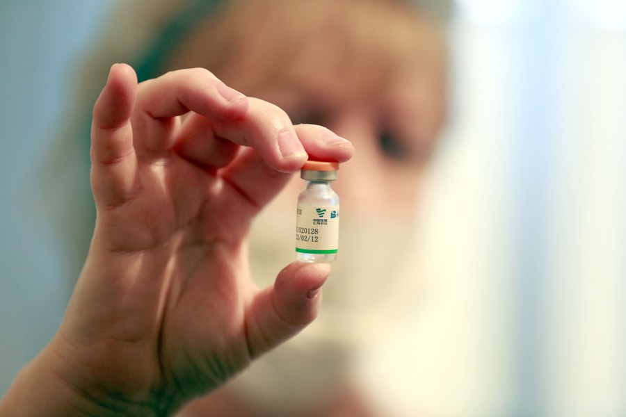 A medical worker shows a dose of Chinese COVID-19 vaccine in Bishkek, capital of Kyrgyzstan, March 29, 2021. (Photo by Roman/Xinhua)