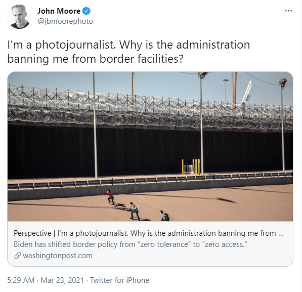 A screenshot shows John Moore sharing a link of his article on the Washington Post titled “I’m a photojournalist. Why is the administration banning me from border facilities?”