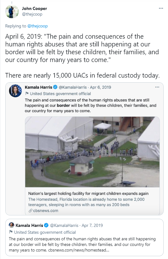 Twitter users are also sharing a tweet by U.S. Vice President Kamala Harris, who tweeted on April 6, 2019: "The pain and consequences of the human rights abuses that are still happening at our border will be felt by these children, their families, and our country for many years to come."