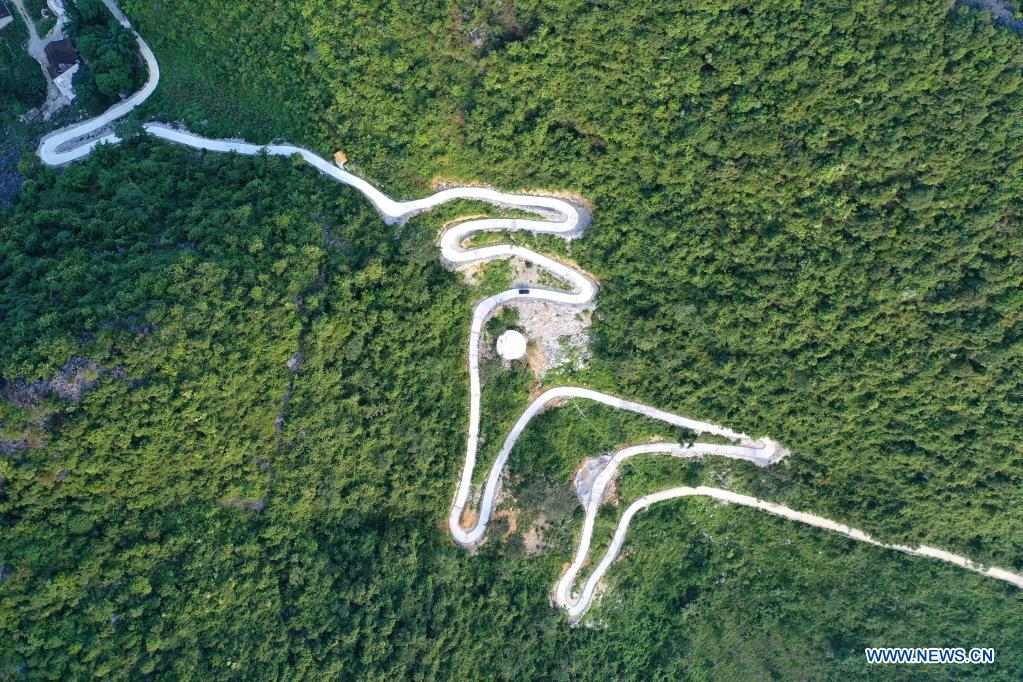 Aerial photo taken on July 22, 2020 shows the road access to Anlan Village of Du'an Yao Autonomous County, south China's Guangxi Zhuang Autonomous Region. Since 2016, Guangxi has promoted the construction and improvement of rural road network, with 52,900-kilometer roads built to link villages in rural areas. (Xinhua/Zhou Hua)