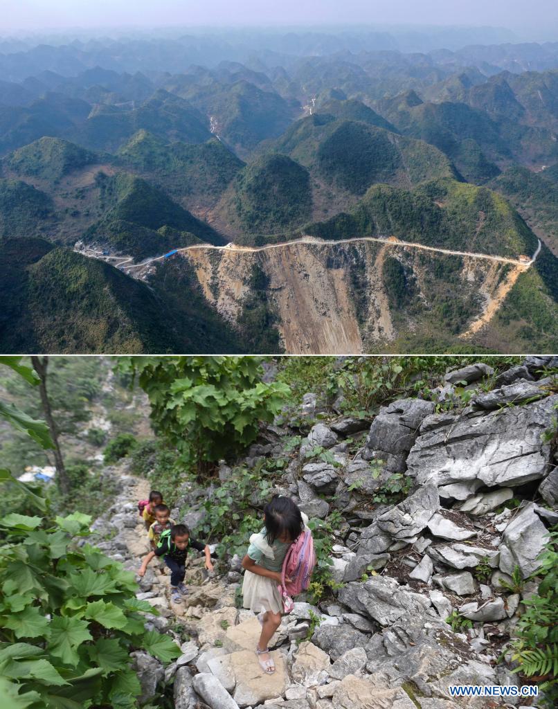 In this combo photo, the upper part taken by a drone on Feb. 7, 2021 shows a road access to Nongmatun of Bahao Village, and the lower part shows children climbing the mountain to return home before the construction of the road on Sept. 23, 2016, in Nongmatun of Bahao Village, Dahua Yao Autonomous County, south China's Guangxi Zhuang Autonomous Region. Since 2016, Guangxi has promoted the construction and improvement of rural road network, with 52,900-kilometer roads built to link villages in rural areas. (Xinhua/Huang Xiaobang)