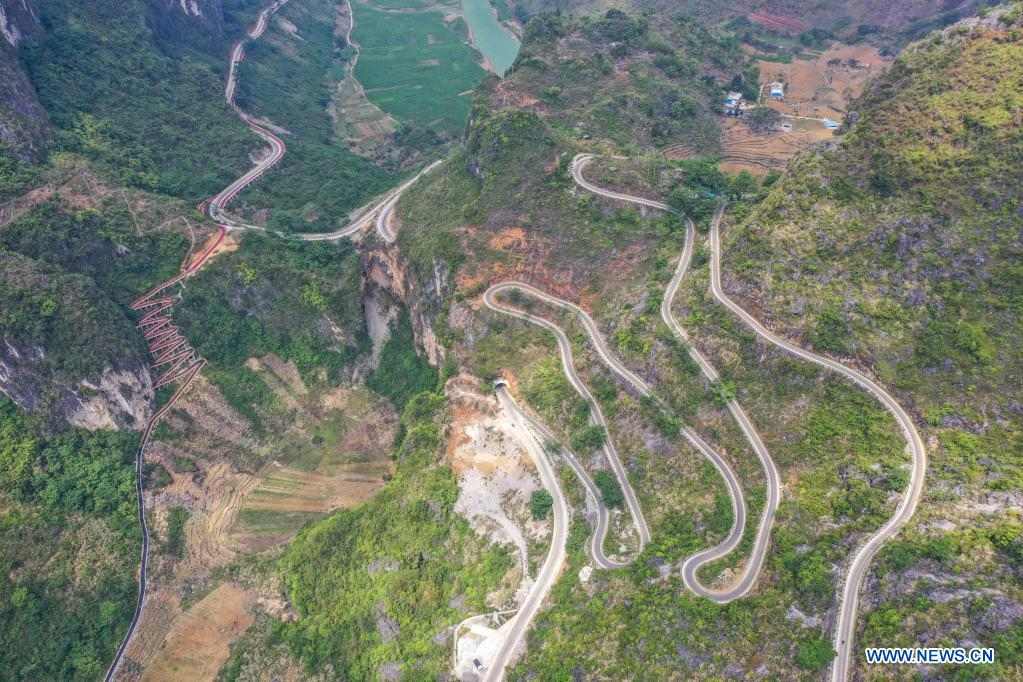 Aerial photo taken on April 16, 2020 shows the Nongfu Road in Lingyun County, south China's Guangxi Zhuang Autonomous Region. Since 2016, Guangxi has promoted the construction and improvement of rural road network, with 52,900-kilometer roads built to link villages in rural areas. (Xinhua/Cao Yiming)