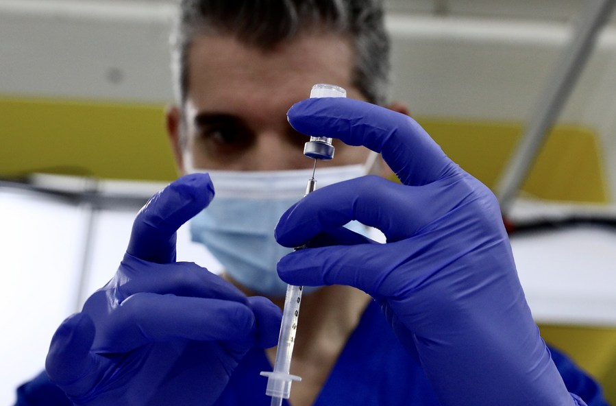 A health care worker prepares a dose of COVID-19 vaccine at a new vaccination site in the California Polytechnic State University in Pomona, Los Angeles County, California, the United States, Feb. 5, 2021. (Xinhua)
