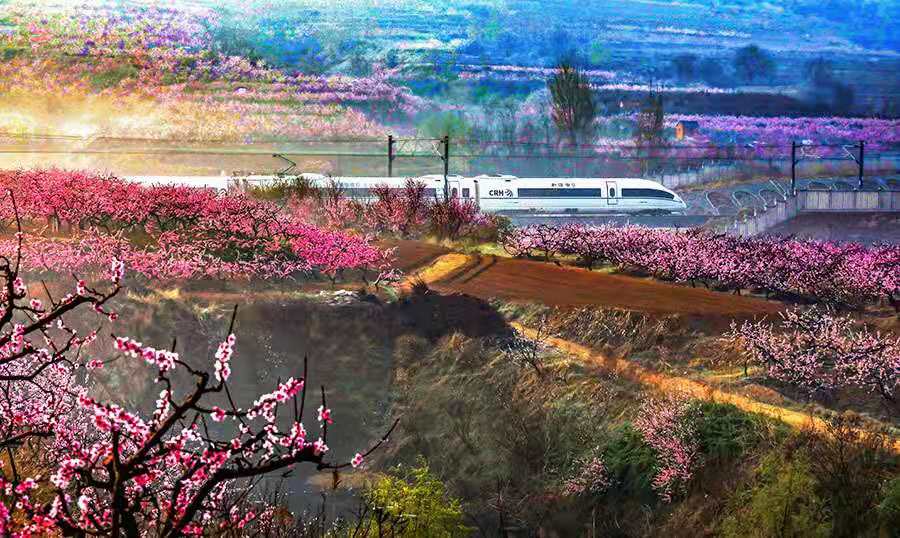 A high-speed train moves past fields of flowers in a section of the Qingdao-Yancheng railway. [Zheng Liangguo/For chinadaily.com.cn]