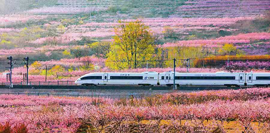 A high-speed train moves past fields of flowers in a section of the Qingdao-Yancheng railway. [Zheng Liangguo/For chinadaily.com.cn]