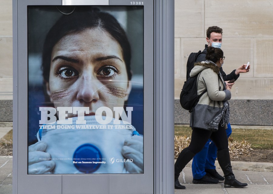 People wearing face masks walk past a poster thanking frontline workers in Toronto, Canada, on March 11, 2021. (Photo by Zou Zheng/Xinhua)