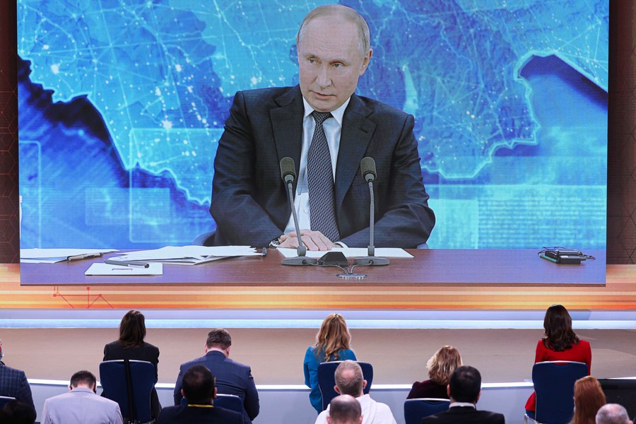 Russian President Vladimir Putin speaks at the annual press conference via video link in Moscow, Russia, Dec. 17, 2020. (Xinhua/Evgeny Sinitsyn)