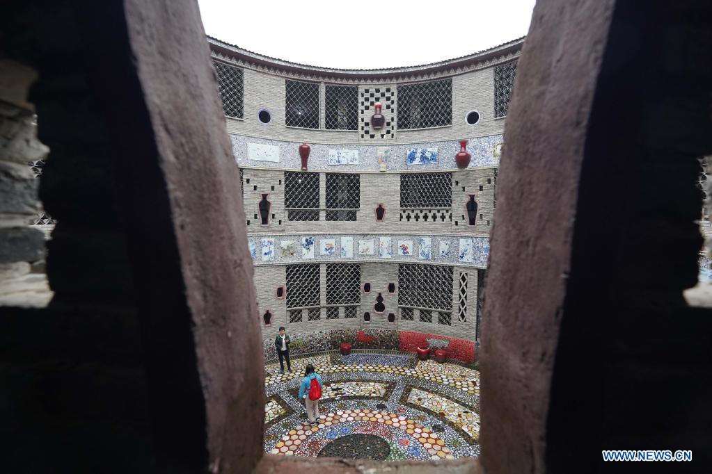 Tourists visit a porcelain palace in Xinping Village of Fuliang County in Jingdezhen, east China's Jiangxi Province, March 19, 2021. Yu Ermei, a 91-year-old villager who once worked in porcelain factory, started to build her porcelain palaces in Xinping Village from 2011. With her efforts, four buildings decorated with porcelain ware and porcelain pieces now stand in the village, attracting many tourists to visit. (Xinhua/Zhou Mi)