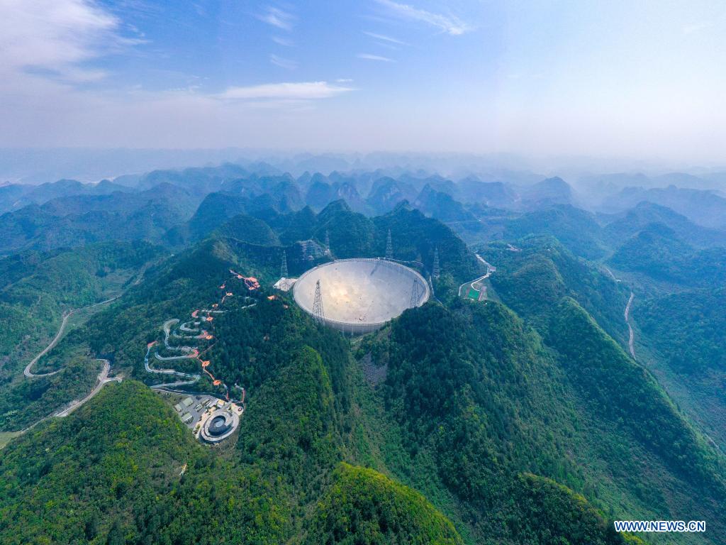 Aerial photo taken on March 29, 2021 shows China's Five-hundred-meter Aperture Spherical Radio Telescope (FAST) under maintenance in southwest China's Guizhou Province. China's FAST officially opened to the world starting Wednesday. (Xinhua/Ou Dongqu)