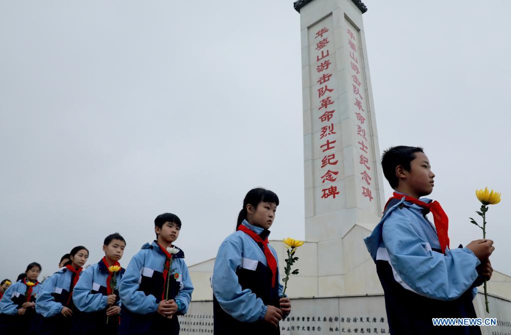Primary school students pay tribute to martyrs at a cemetery in Huaying City, southwest China's Sichuan Province, April 1, 2021. The Tomb-sweeping Day, also known as Qingming Festival, which falls on April 4 this year, is a Chinese festival when people pay tribute to the dead and worship their ancestors by visiting tombs and making offerings. (Photo by Zhou Songlin/Xinhua)