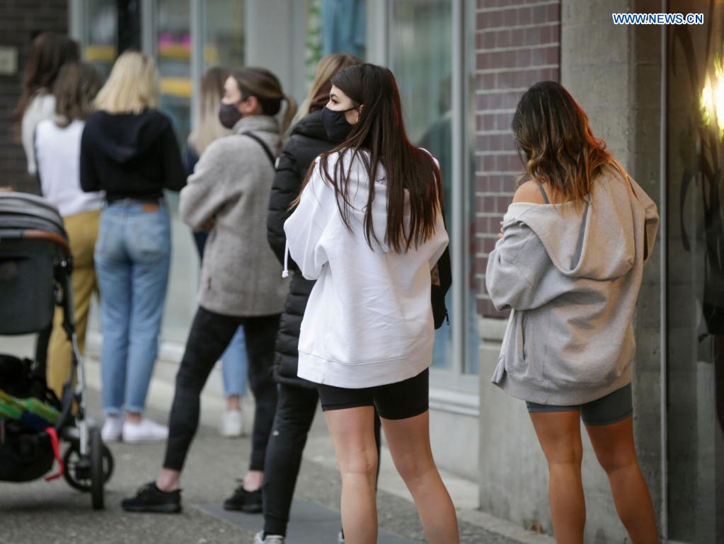 Young people wearing face masks line up outside a store in downtown Vancouver, British Columbia, Canada, April 1, 2021. As of Thursday afternoon, Canada reported a cumulative total of 986,011 COVID-19 cases and 22,993 deaths, according to CTV. While COVID-19 continues to impact people of all ages in Canada, infection rates are the highest among those aged 20 to 39 years of age. (Photo by Liang Sen/Xinhua)