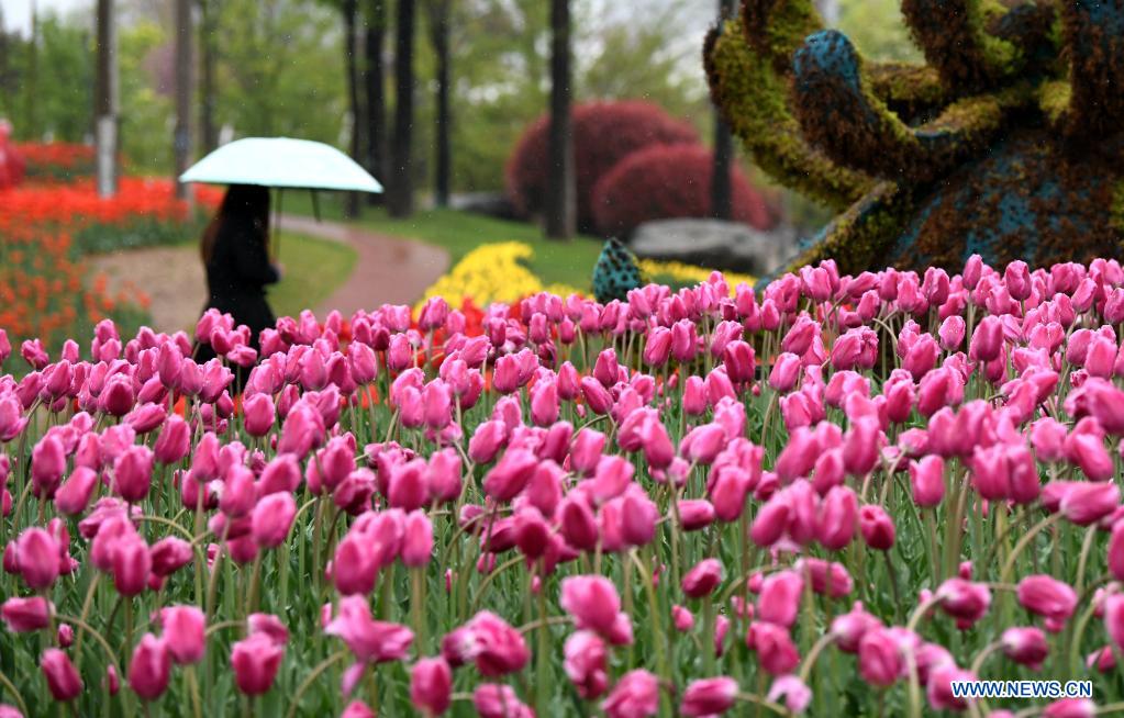 A tourist enjoys flowers at Xi'an Botanical Garden in Xi'an, northwest China's Shaanxi Province, April 1, 2021. The 29th spring flower show kicked off recently at Xi'an Botanical Garden. There are more than 30 kinds of tulips planted in the flower show with a total of 200,000 tulips planted in 3,000 square meters. (Xinhua/Li Yibo)