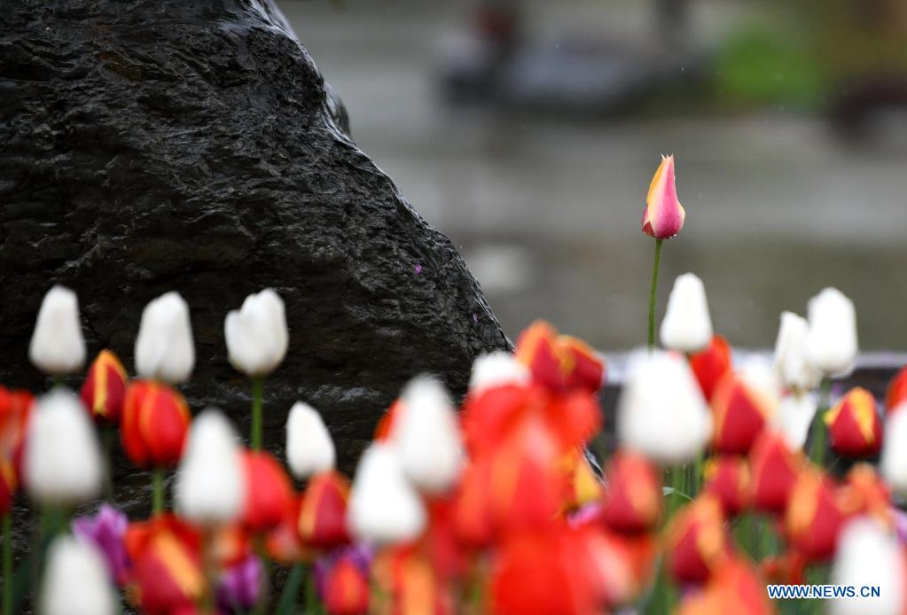 Photo taken on April 1, 2021 shows tulips at Xi'an Botanical Garden in Xi'an, northwest China's Shaanxi Province. The 29th spring flower show kicked off recently at Xi'an Botanical Garden. There are more than 30 kinds of tulips planted in the flower show with a total of 200,000 tulips planted in 3,000 square meters. (Xinhua/Li Yibo)