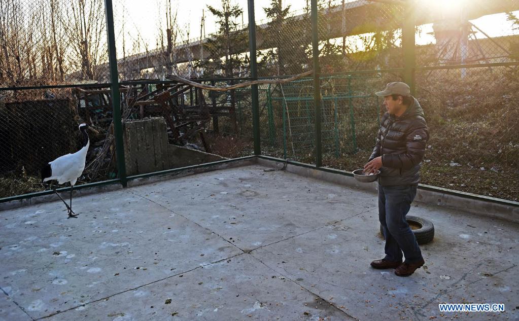 File photo taken on Nov. 24, 2016 shows Wang Weiyan feeding a red-crowned crane at the Shenyang Raptor Rescue Center in Shenyang, northeast China's Liaoning Province. The Shenyang Raptor Rescue Center is home to injured raptors of all kinds. Wang Weiyan, 58, is the director of the center. Out of deep love for birds, Wang became a volunteer in bird protection. He works as a raptor rehabilitator and has devoted the most precious years of his life to bird care. Established in July 2009 by a group of bird lovers and bird protectors, the Shenyang Raptor Rescue Center has three rescue bases, a cooperative pet hospital, an online WeChat group, and more than 180 volunteers. The volunteers have various occupations such as zoologists, doctors, journalists, teachers, students, workers, farmers and many other professions. The center works on the treatment of injured raptors and birds that are unable to survive independently in the wild. It has so far rescued more than 3,000 wild birds, with the survival rate reaching 70 percent. More than 90 percent of the survivors have been successfully released into nature. Wang Weiyan, who has been engaged in the rescue of raptors for 25 years, is now a bird saving master. He can cure a variety of bird diseases, and he is also willing to pass on his experience to more young people. Now, more young volunteers have joined in the bird protection work. They publicize the knowledge of bird protection in an easy way on the popular Chinese short-video social media platform Douyin. On March 14, more than a dozen once injured goshawks, kestrels, vultures, and eagle owls were released at the Shenyang Raptor Rescue Center. To the bird protection volunteers, it was the happiest moment to see the birds returning to the sky. (Xinhua/Yang Qing)