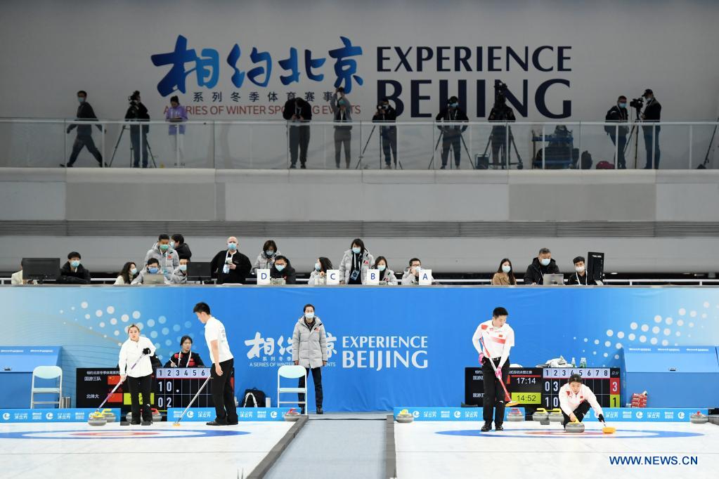 Athletes compete during a curling test program at National Aquatics Center in Beijing, April 1, 2021. A 10-day ice sports test program for the 2022 Olympic and Paralympic Winter Games is held between April 1 and 10, 2021. This test program is to give a test to competition organization, venue operation, and services and safeguarding. It will engage all ice sports of Beijing 2022, namely short track speed skating, speed skating, figure skating, ice hockey, curling, para ice hockey and wheelchair curling. (Xinhua/Ju Huanzong)