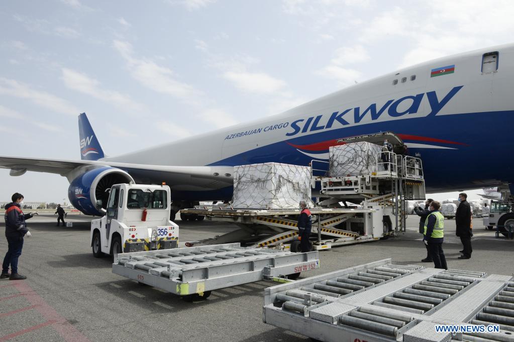 Staff members unload the newly-arrived vaccines, manufactured by China's biopharmaceutical company Sinovac Biotech, at the airport in Baku, Azerbaijan, April 1, 2021. Azerbaijan on Thursday received the first batch of COVID-19 vaccines it has purchased from China as part of efforts to curb the spread of COVID-19. (Photo by Tofik Babayev/Xinhua)