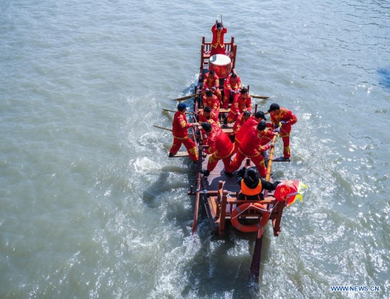 A traditional rowing race in worship of Canshen, the local patron god of silkworm raisers, is seen during a temple fair at Qinghe Village, Zhouquan Township, Tongxiang City of east China's Zhejiang Province, April 4, 2021. (Xinhua/Xu Yu)