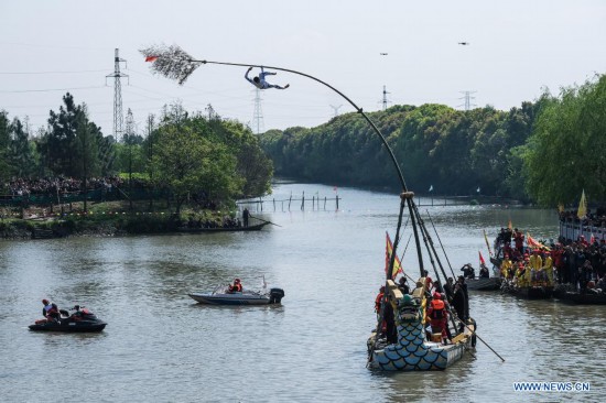 An acrobatic performance in worship of Canshen, the local patron god of silkworm raisers, is seen during a temple fair at Qinghe Village, Zhouquan Township, Tongxiang City of east China's Zhejiang Province, April 4, 2021. (Xinhua/Xu Yu)